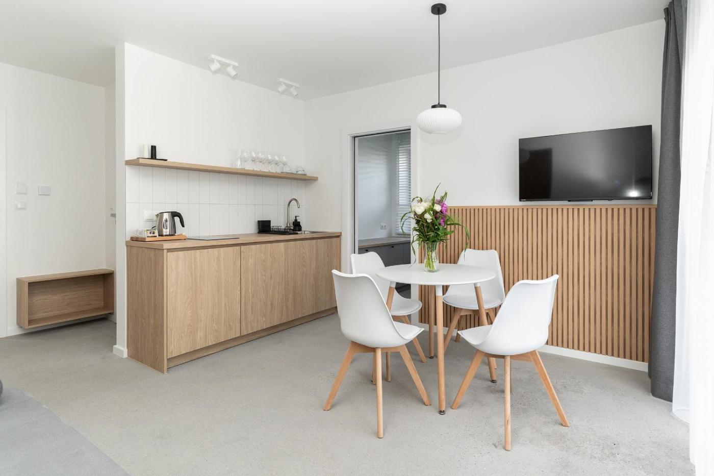 Apartament Premium z 1 sypialnią. Featuring 1 bedroom and 1 bathroom with a bath, this apartment offers a well-fitted kitchenette and a terrace. The apartments kitchenette, which features a refrigerator, is available for cooking and storing food. Boasting a balcony with garden views, this apartment also provides a tea and coffee maker and a flat-screen TV. The unit has 1 bed. Apartament - 2 osobowy. Powierzchnia pokoju ok.: 23 mkw. ;
